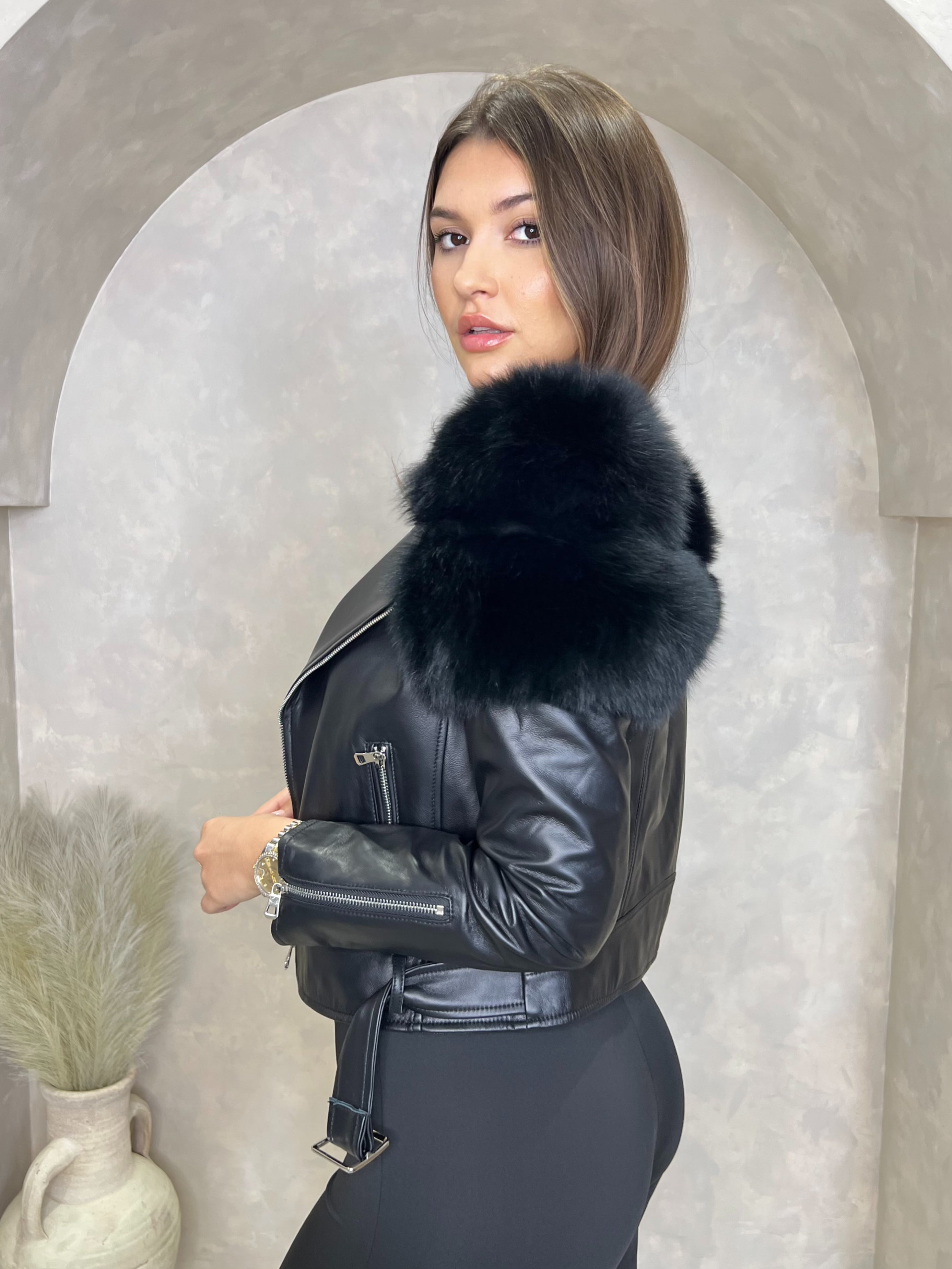 Crafted from high-quality fox fur, this luxurious biker jacket is collarless and features fox fur shoulders for a stylish and edgy look. The zip fastening adds convenience while the biker jacket design adds an element of cool. Elevate your wardrobe with this must-have jacket.