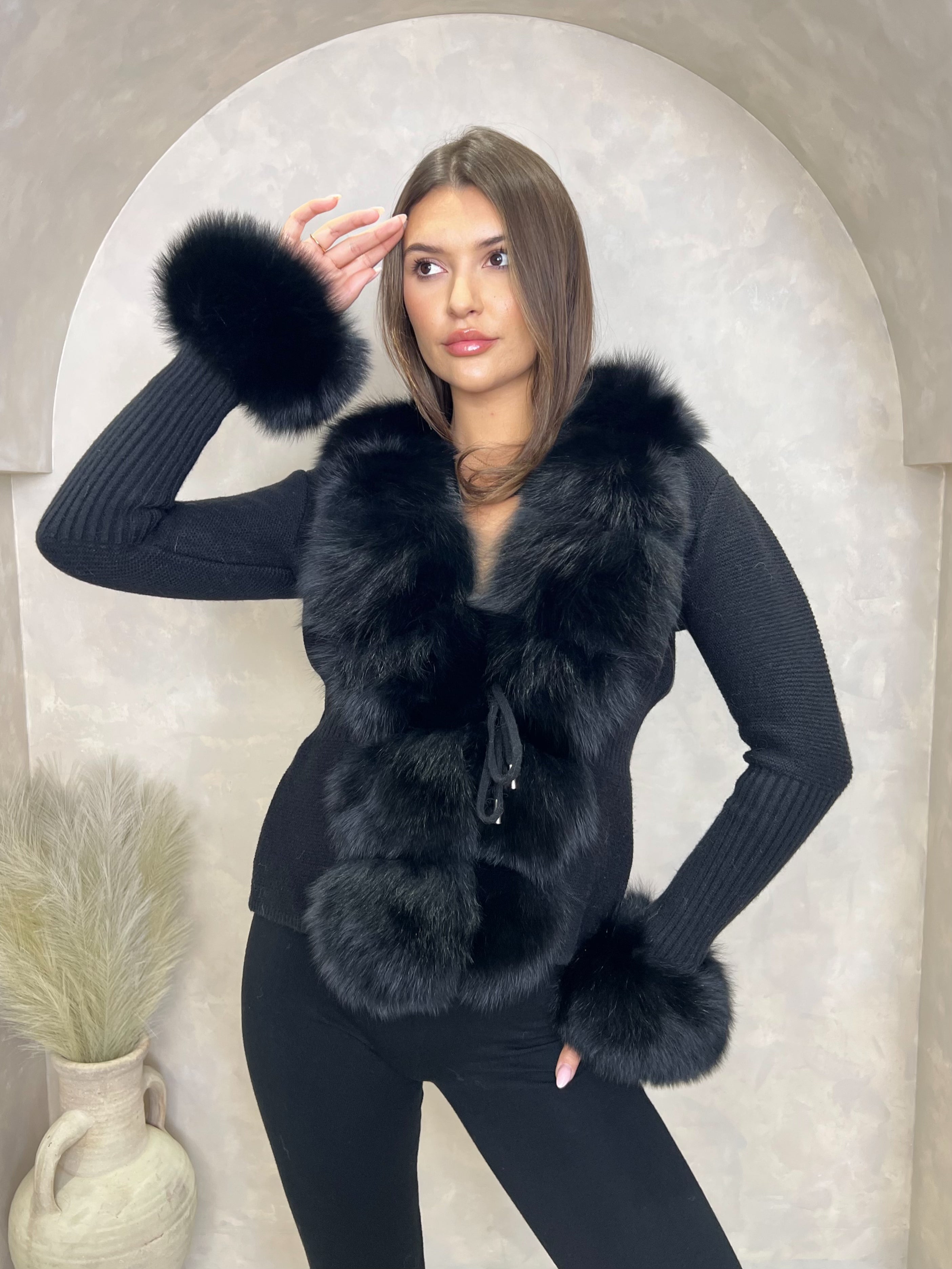 Indulge in luxury with our Luxury Fur Cardigan. Made with soft knitted fabric, fur cuffs, and a fur front, this cardigan elevates any outfit. The drawstring adds a touch of elegance and versatility. Stay warm and stylish with our premium cardigan.