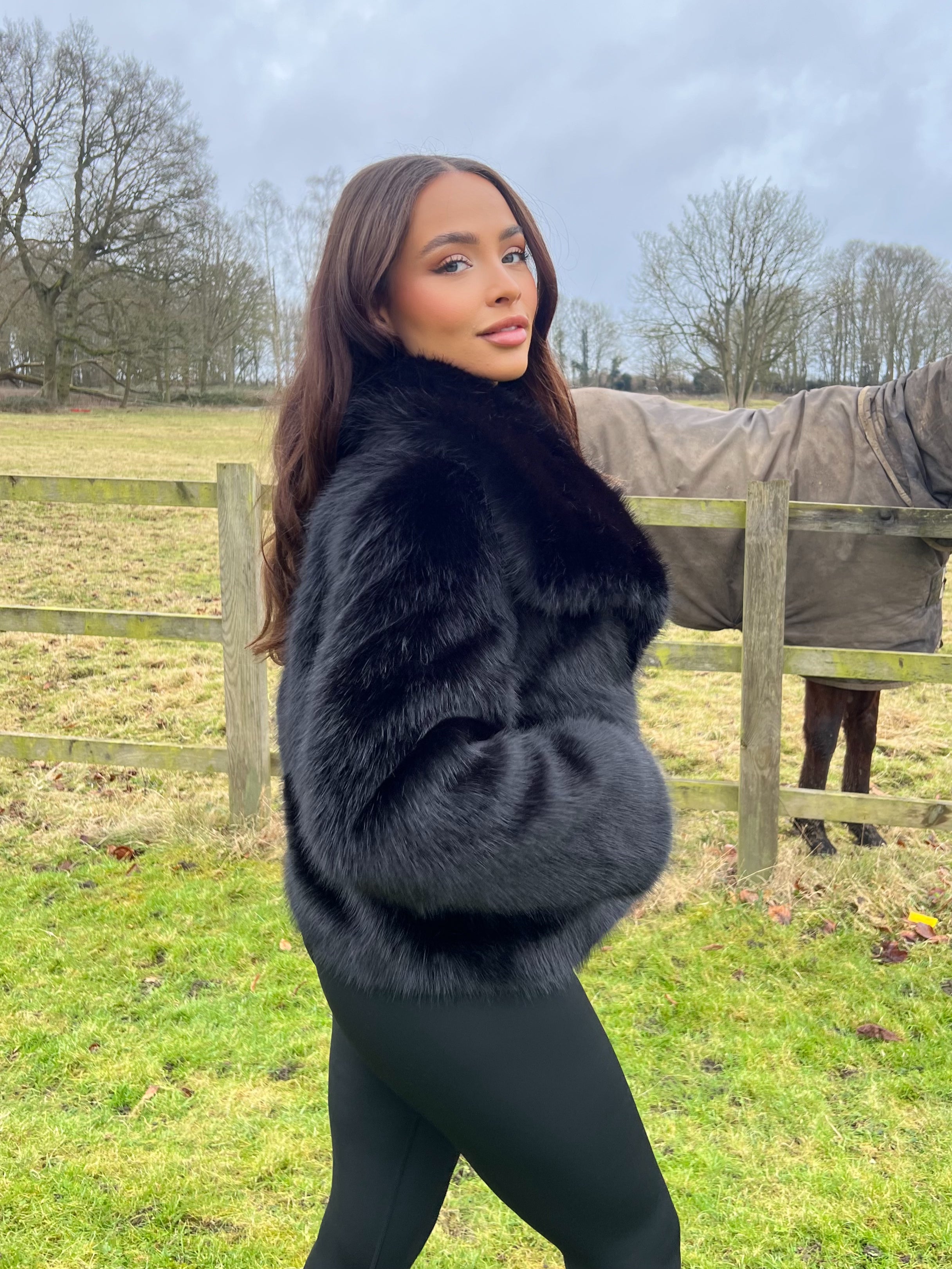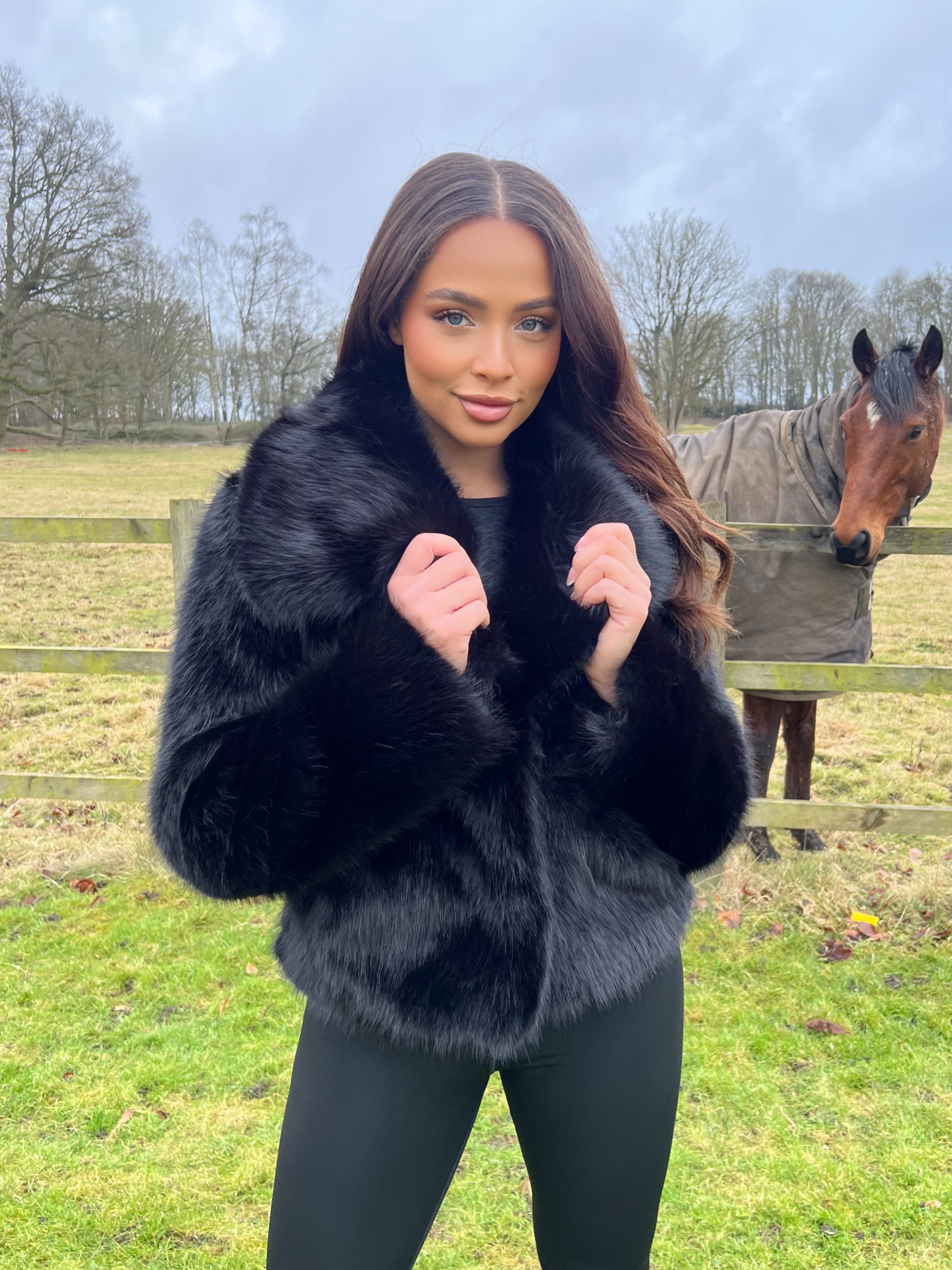 Expertly crafted with a large, luxurious collar and long sleeves for warmth and style. Made from premium faux fur, this elegant jacket is both fashionable and functional. Fastens securely with a hook and eye closure. Stay stylish and cozy this season with our Premium Faux Fur Collared Jacket.