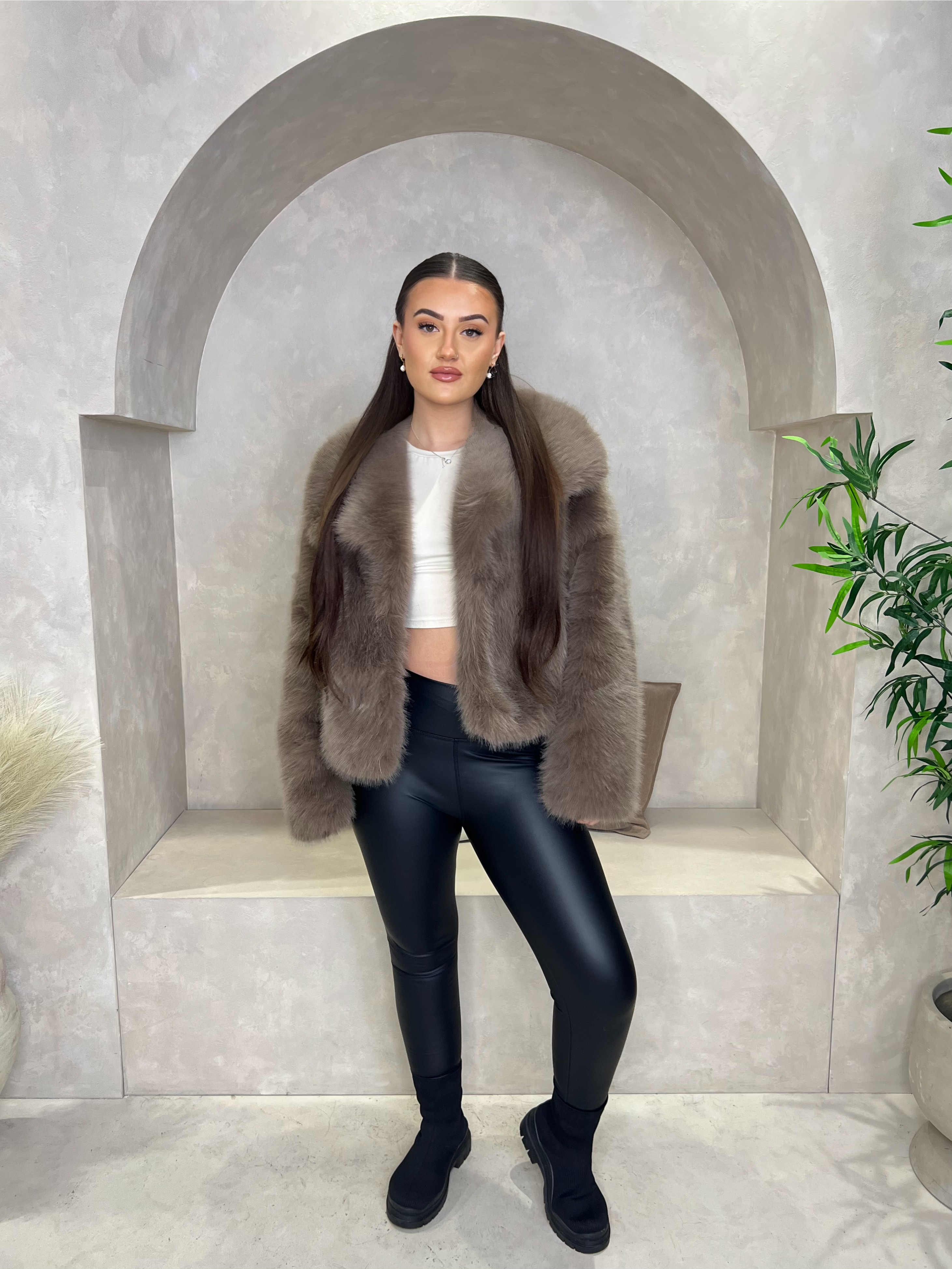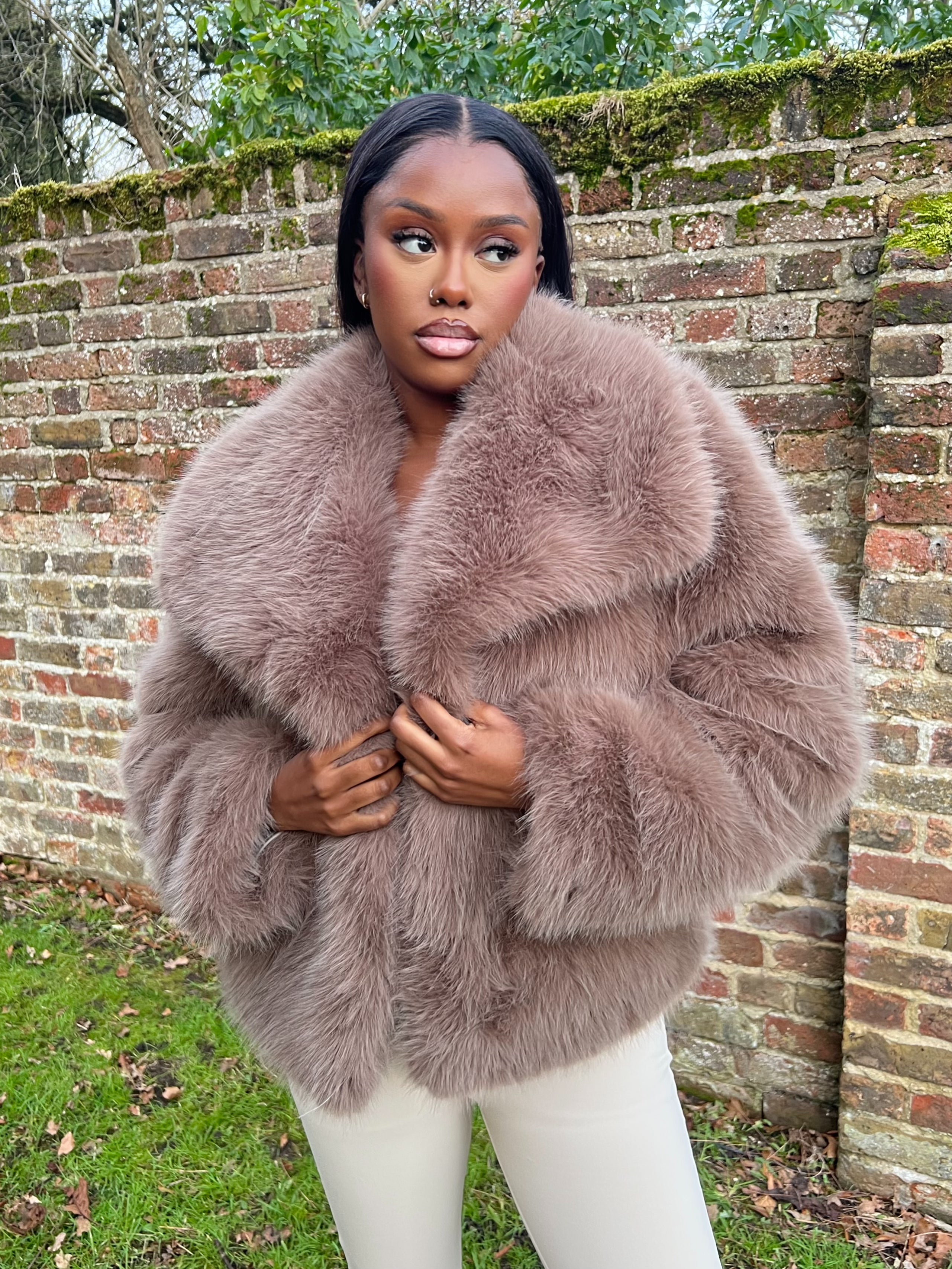Expertly crafted with a large, luxurious collar and long sleeves for warmth and style. Made from premium faux fur, this elegant jacket is both fashionable and functional. Fastens securely with a hook and eye closure. Stay stylish and cozy this season with our Beige Premium Faux Fur Collared Jacket.