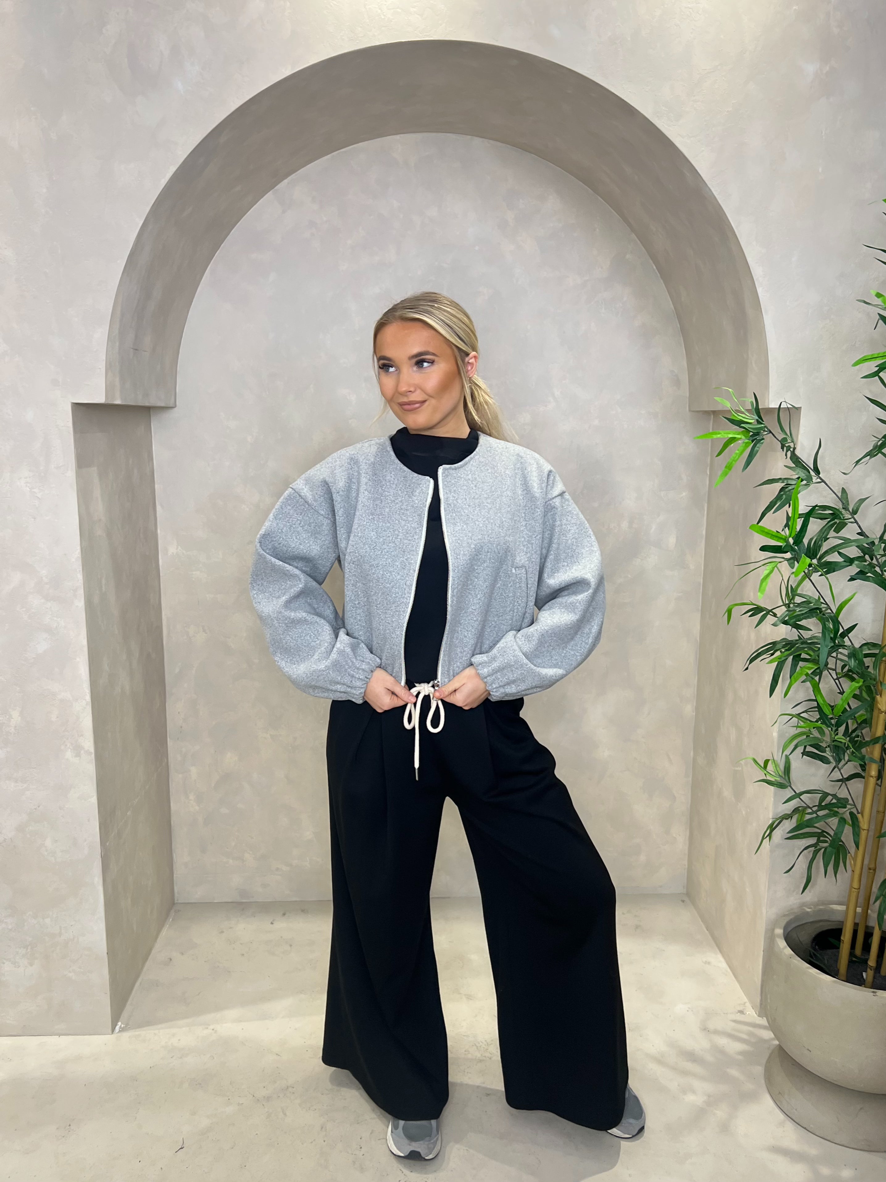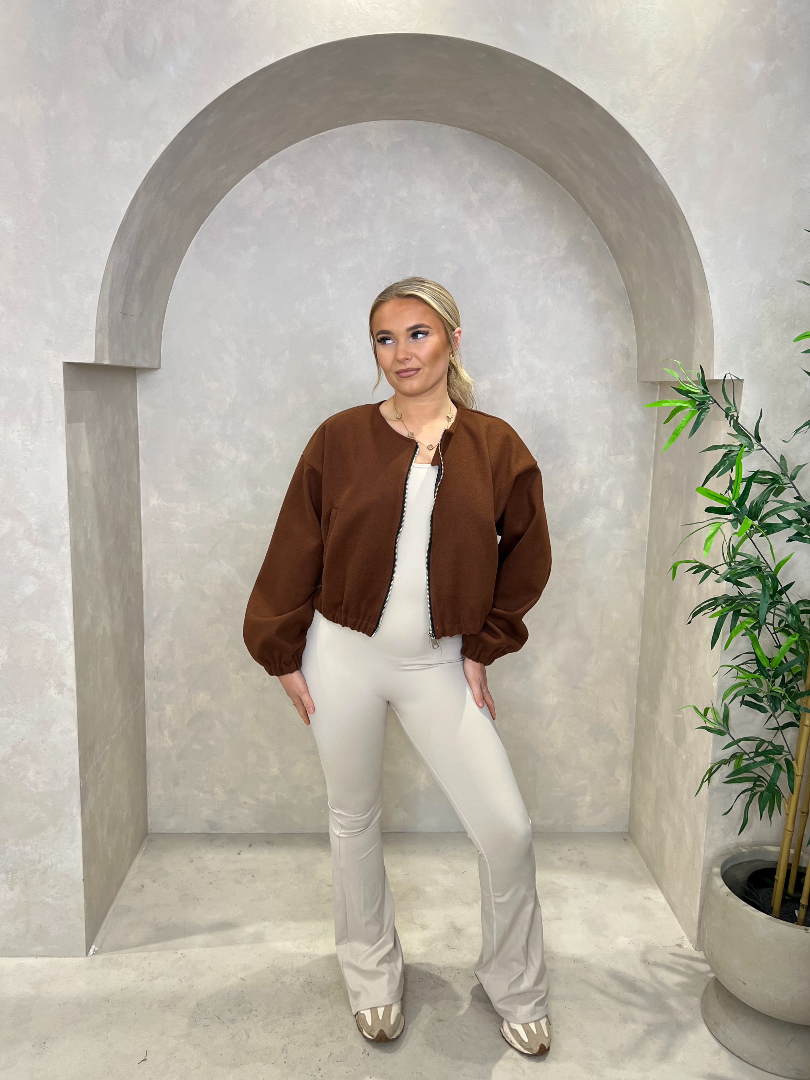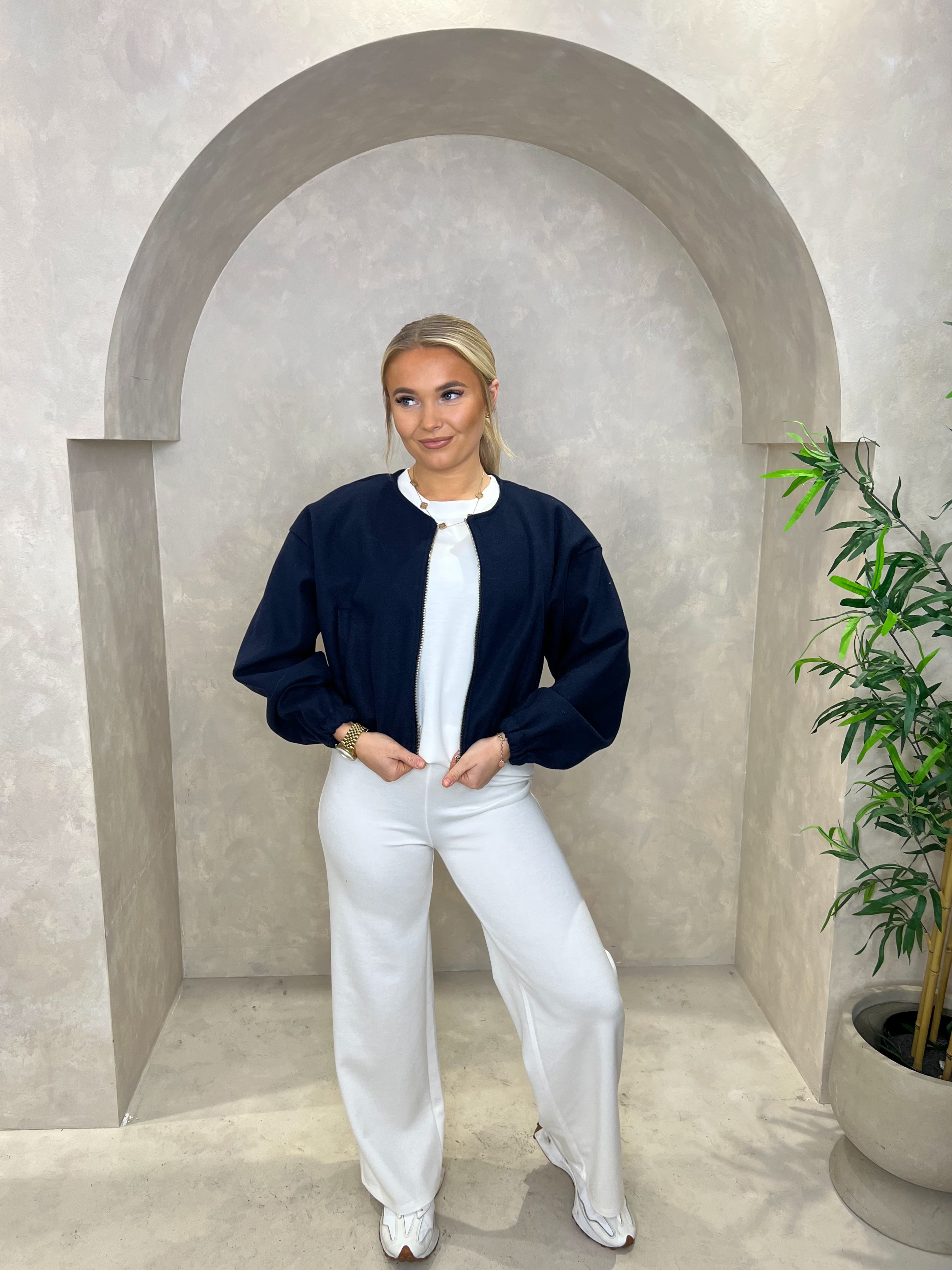 This collarless bomber jacket features elasticated cuffs, as well as two pockets for convenience. The zip fastening allows for easy and secure closure. Stay stylish and functional with this modern jacket.