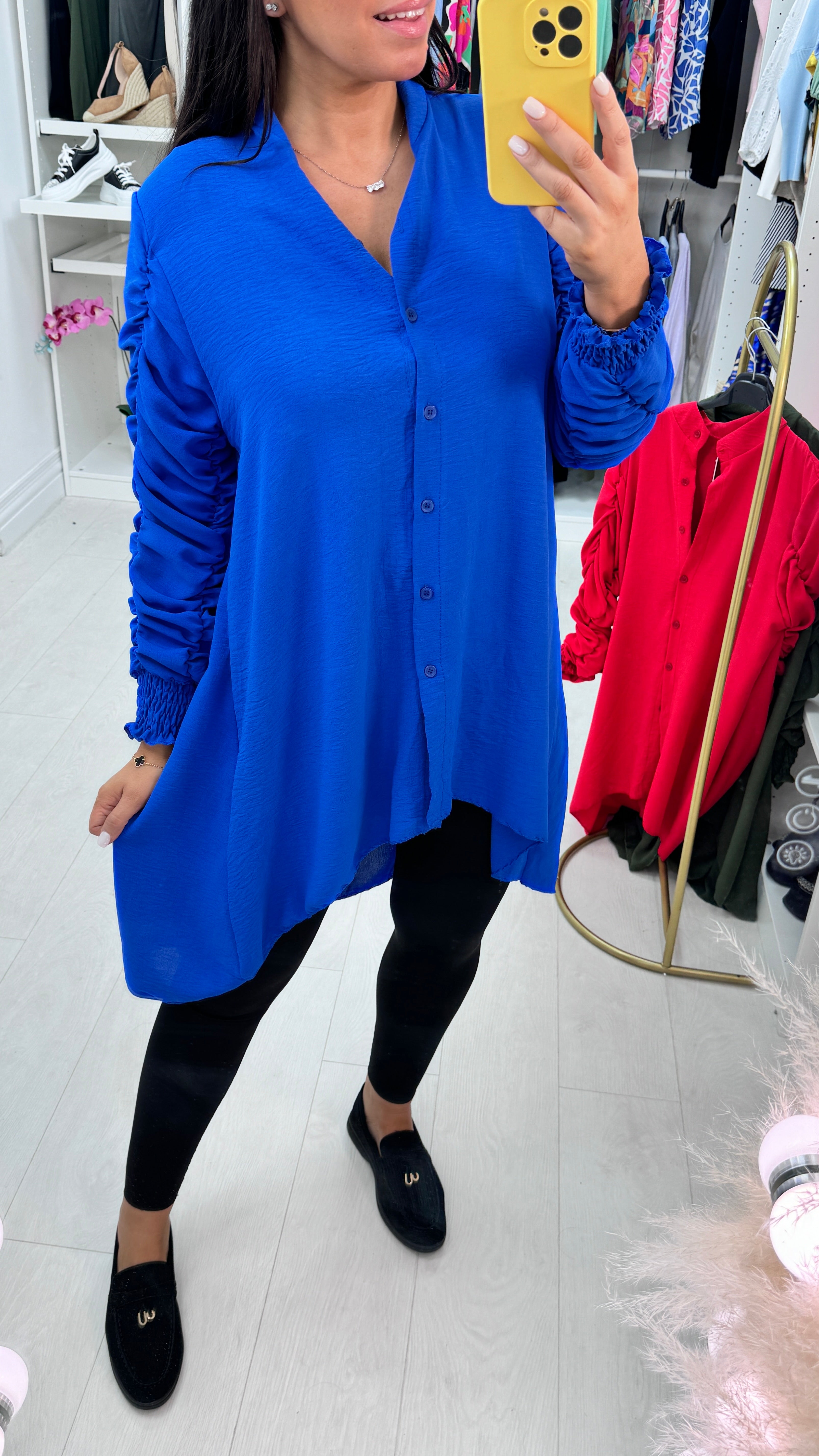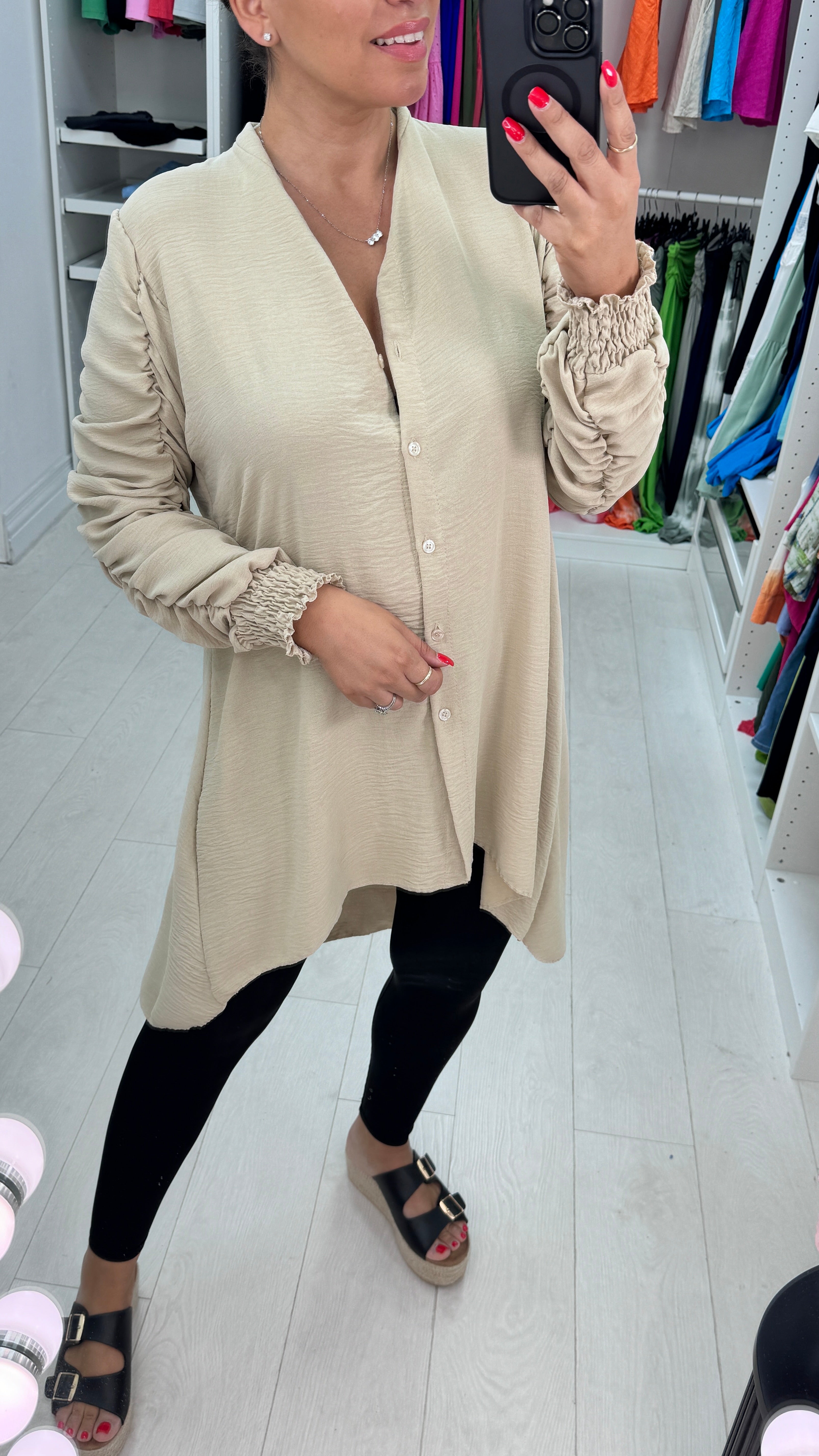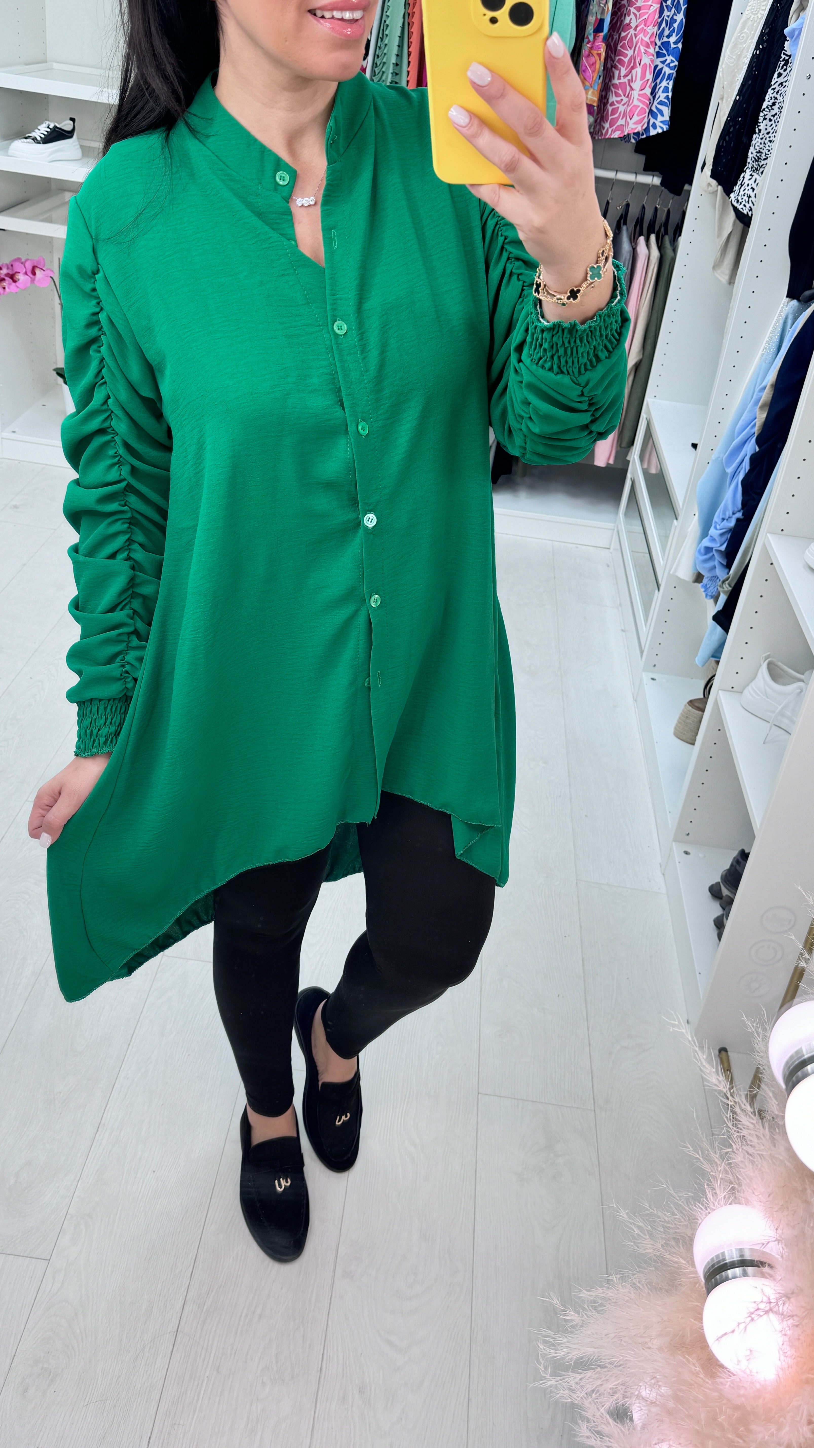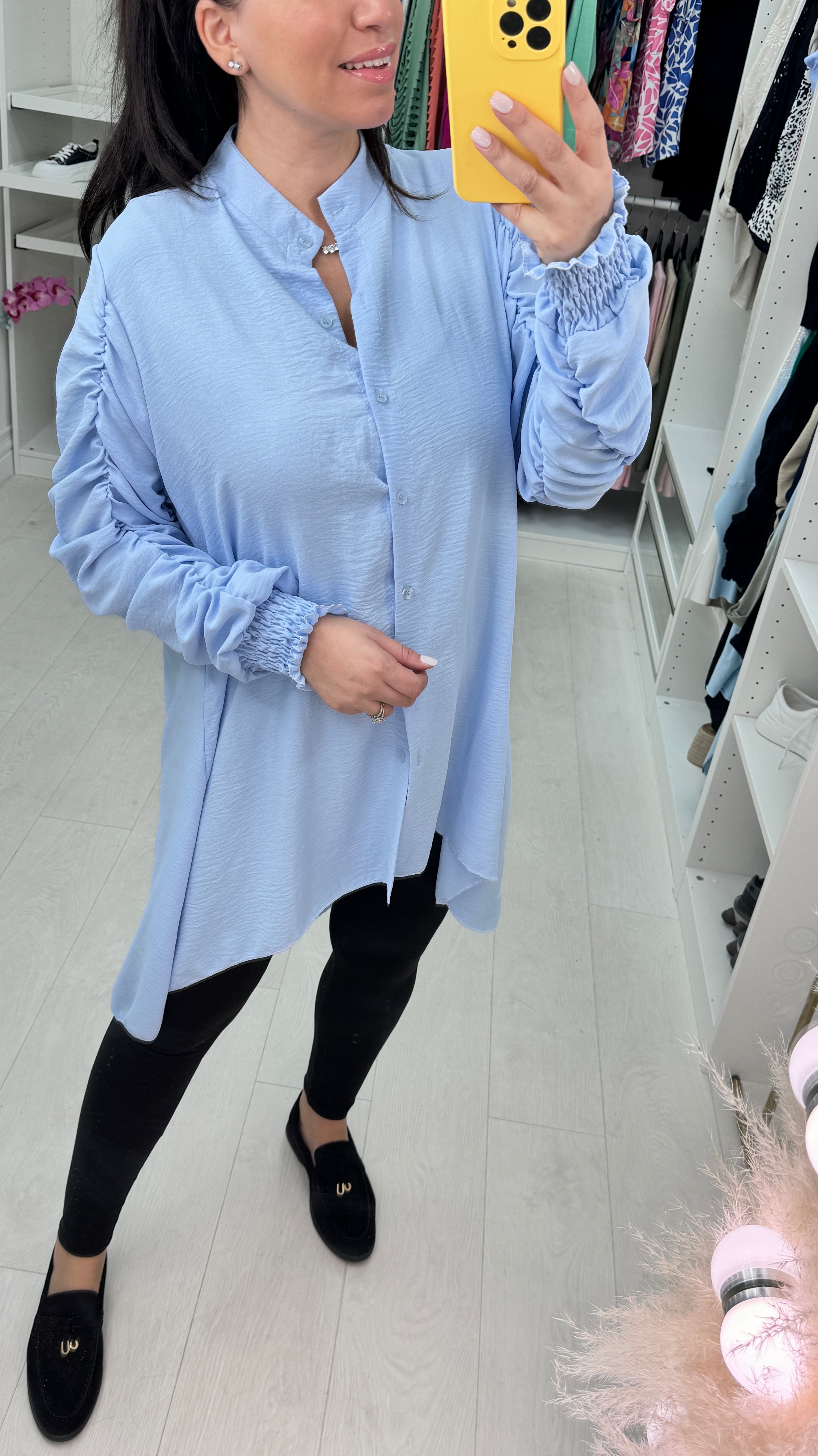 Cora Dipped Hem Ruched Sleeve Shirt