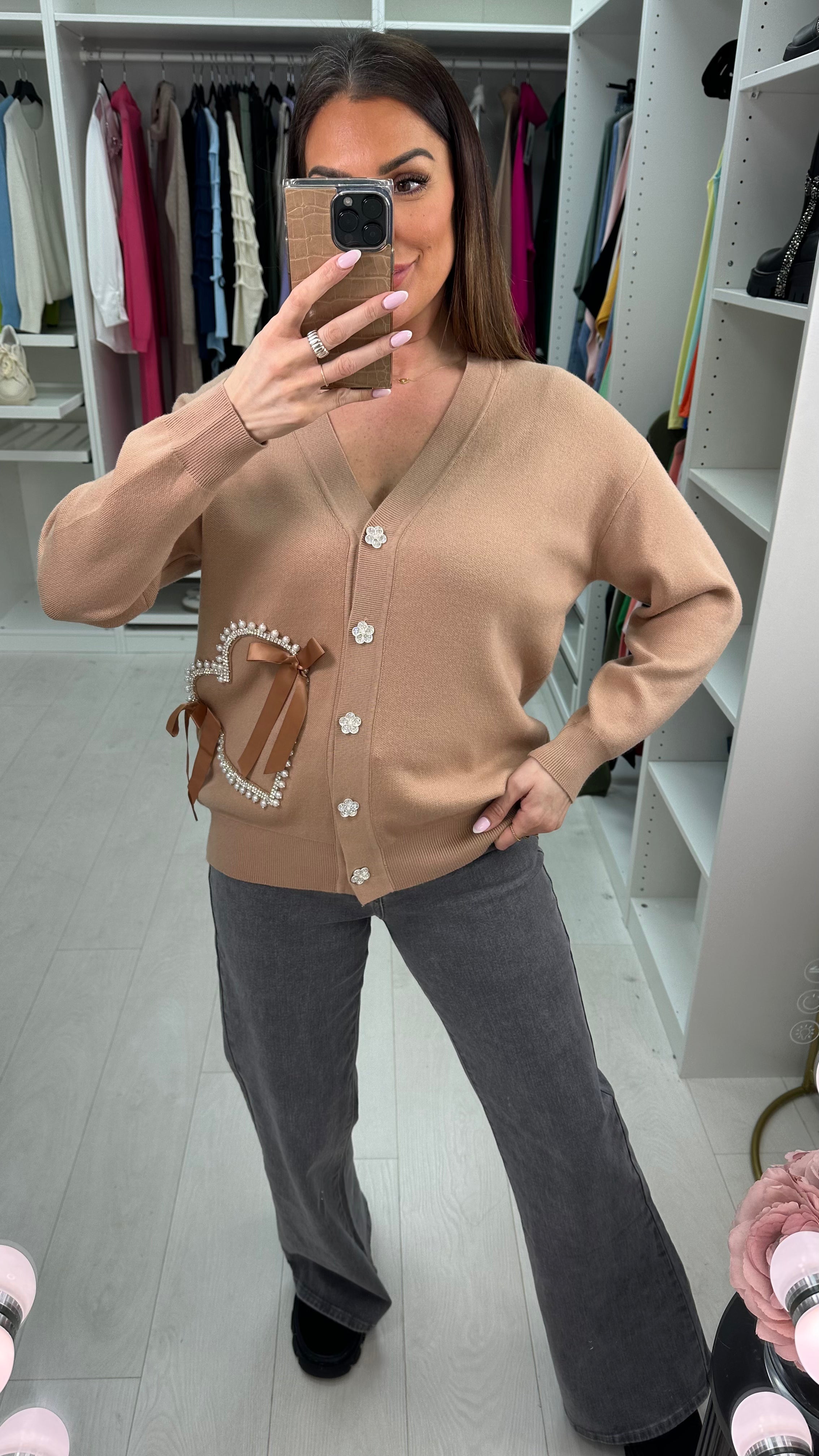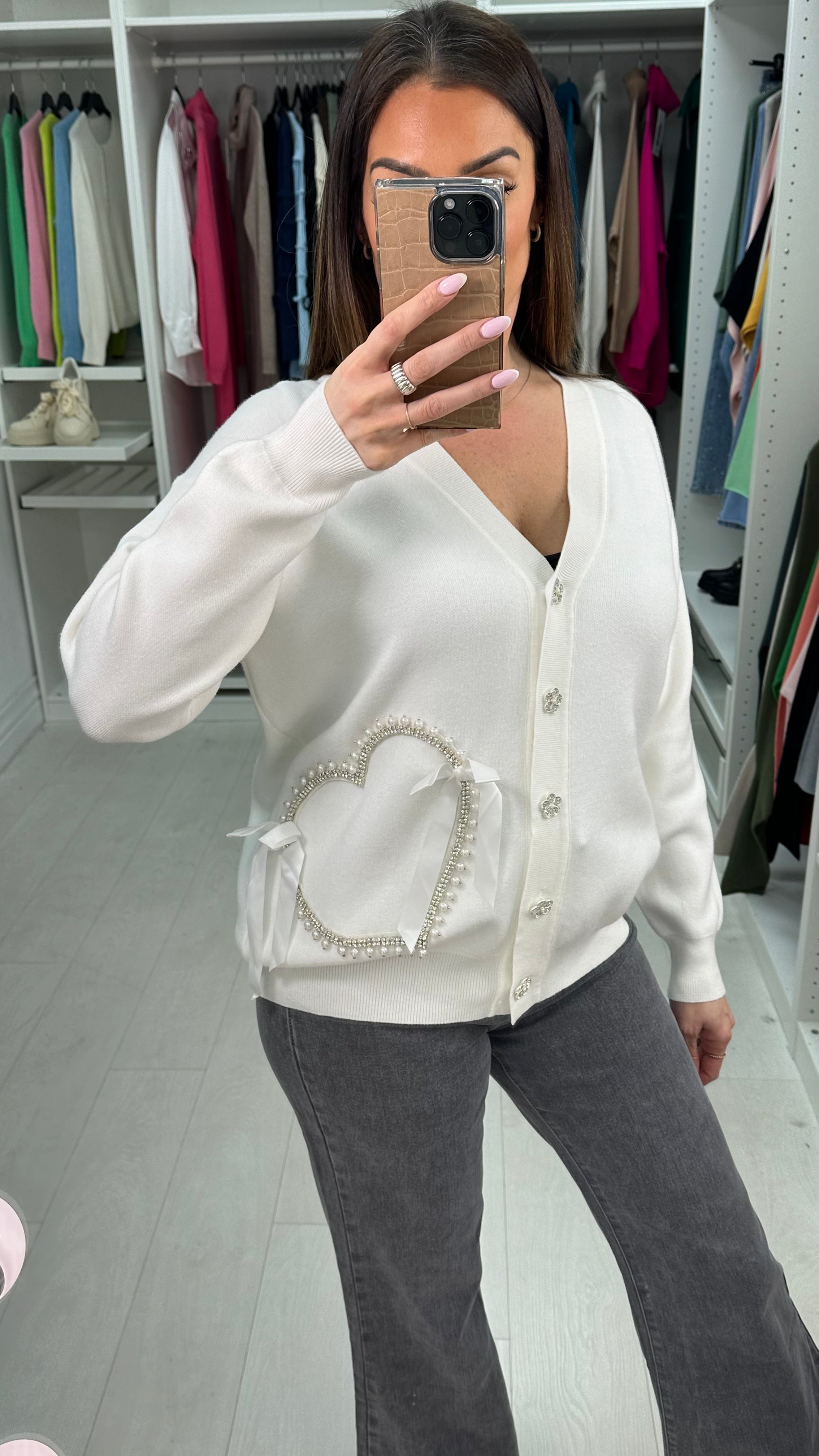 Elliana Embellished Heart V Neck Cardigan