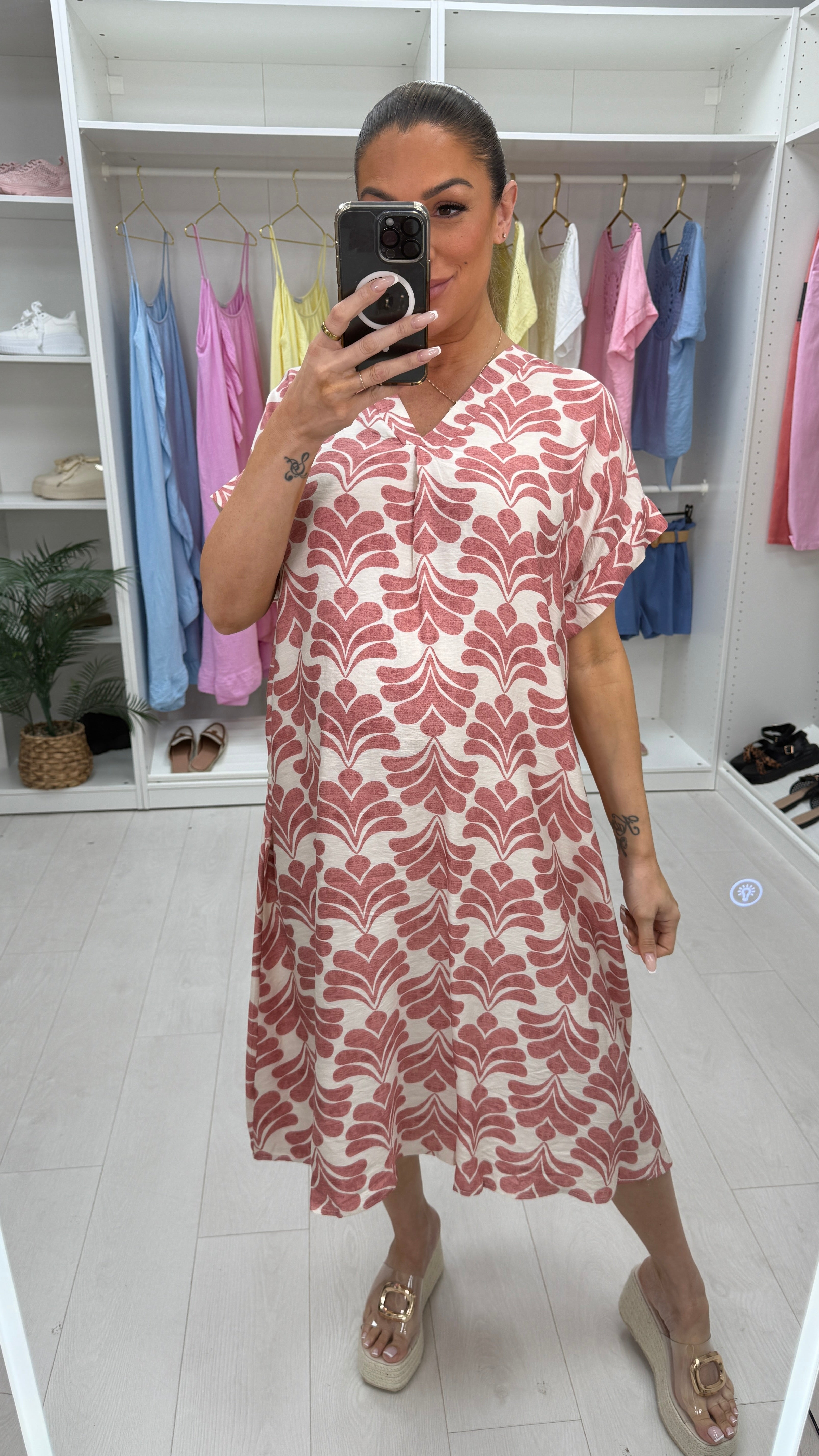 Experience effortless style with the Fenella Mosaic Print Loose Fit V Neck Dress. Designed with a flattering V neckline and short sleeves, this lightweight, floaty dress offers all-day comfort. Perfect for warm days, its loose fit allows freedom of movement while the vibrant mosaic print adds a touch of artistic charm to your wardrobe. Elevate your casual look with this versatile and easy-to-wear dress. Model Is Size 12/14 and wears a size 10/14 labelled M/L