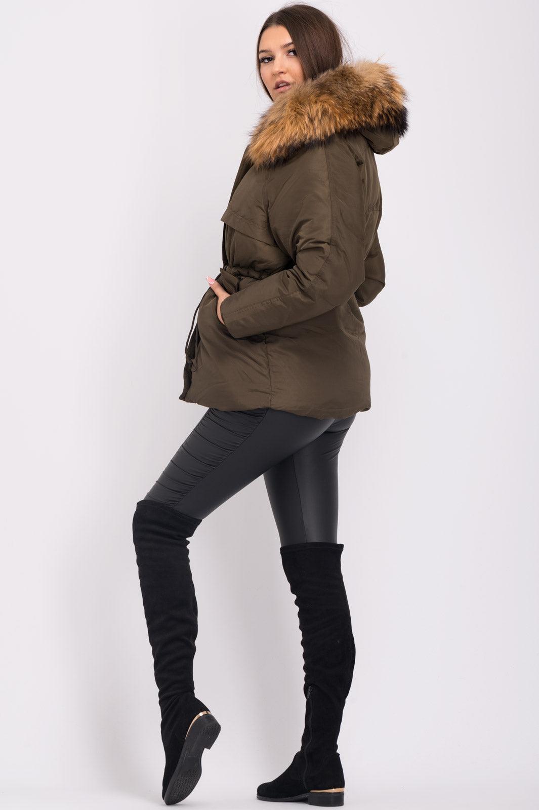 Khaki Luxury Fur Padded Stopper Drawstring Coat
