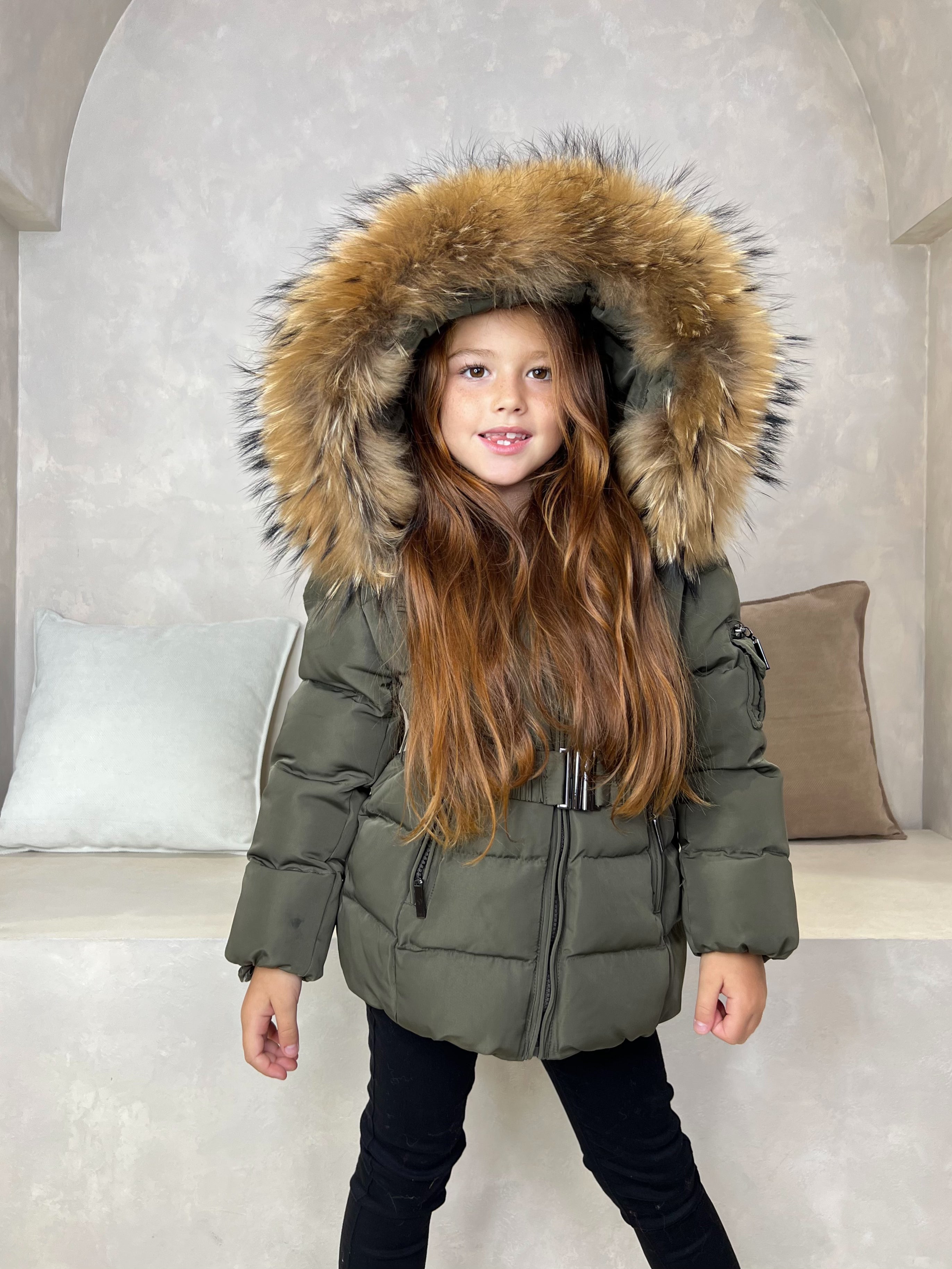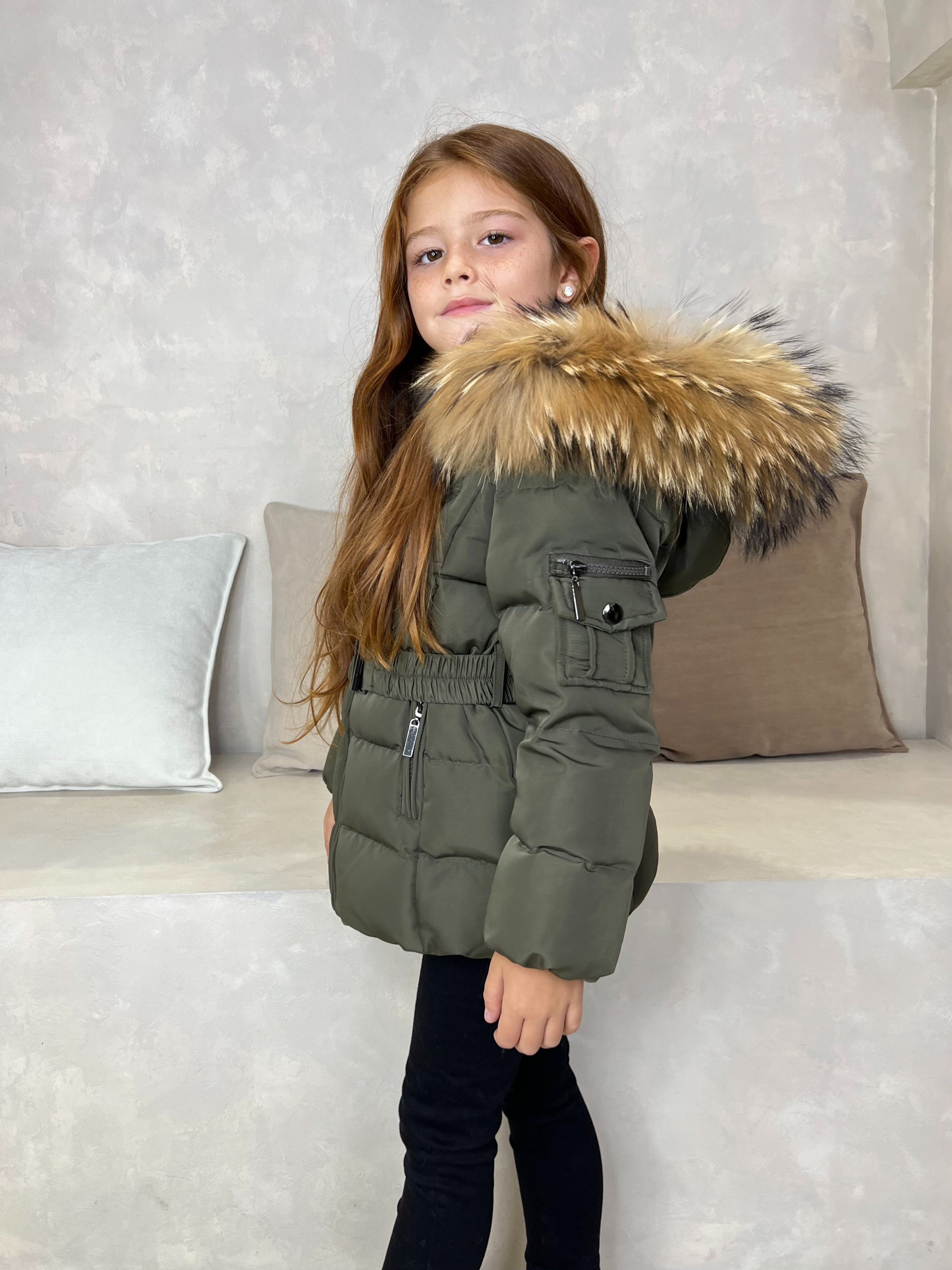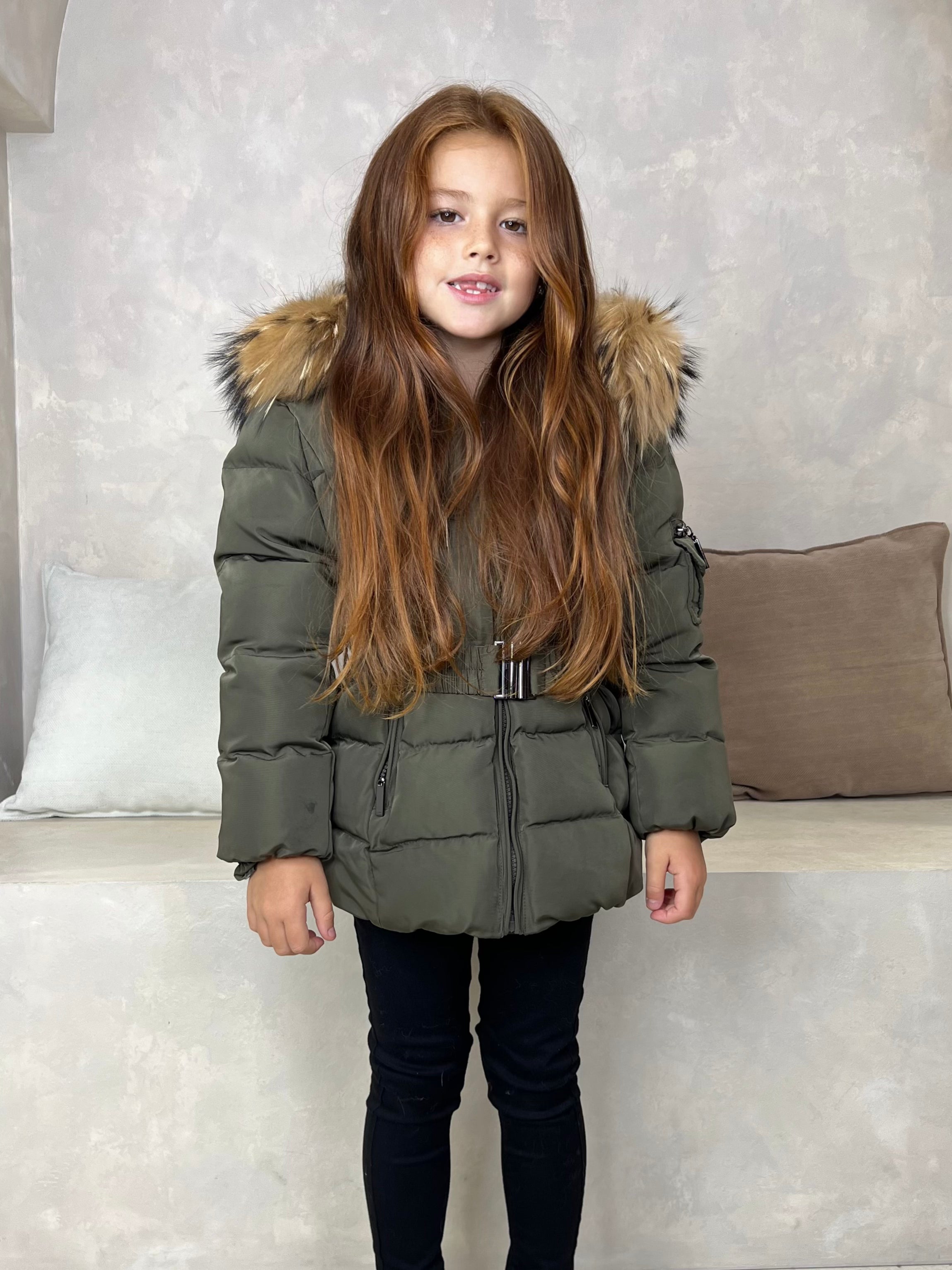 Childrens Khaki Luxury Fur Padded Belted Coat