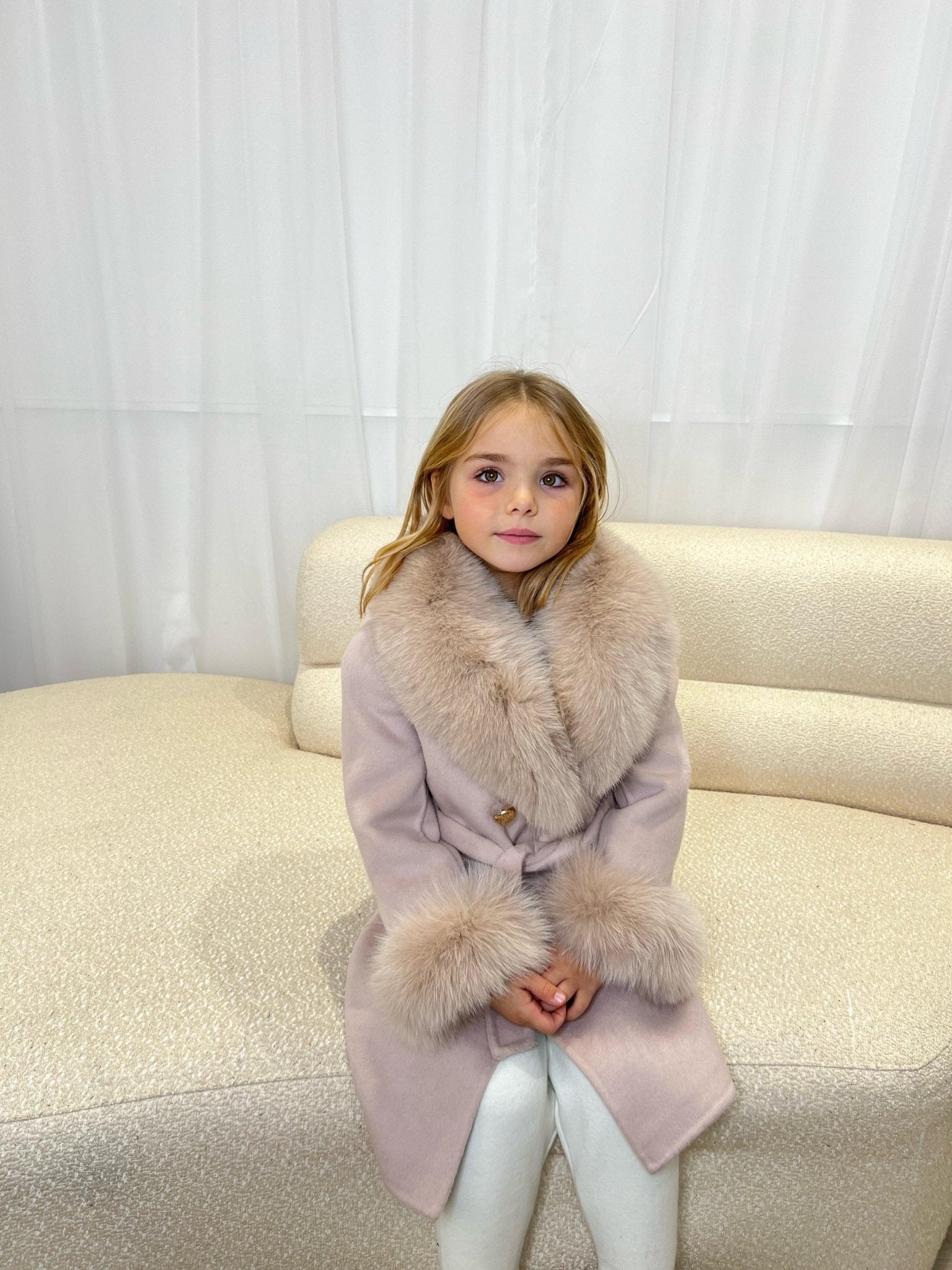 Keep your child cozy and warm with this luxurious coat. Crafted with premium cashmere and latte fur, this coat is sure to have your child looking and feeling their best. Featuring shawl collar and two pockets, this garment keeps your child trendy and prevents any chill. Designed with breathability and warmth in mind, this plush coat is crafted with high-quality cashmere and latte fur, providing comfort and style all winter long. The shawl collar and two pockets add both practicality and elegance to this luxurious garment that will have your child looking and feeling their best.