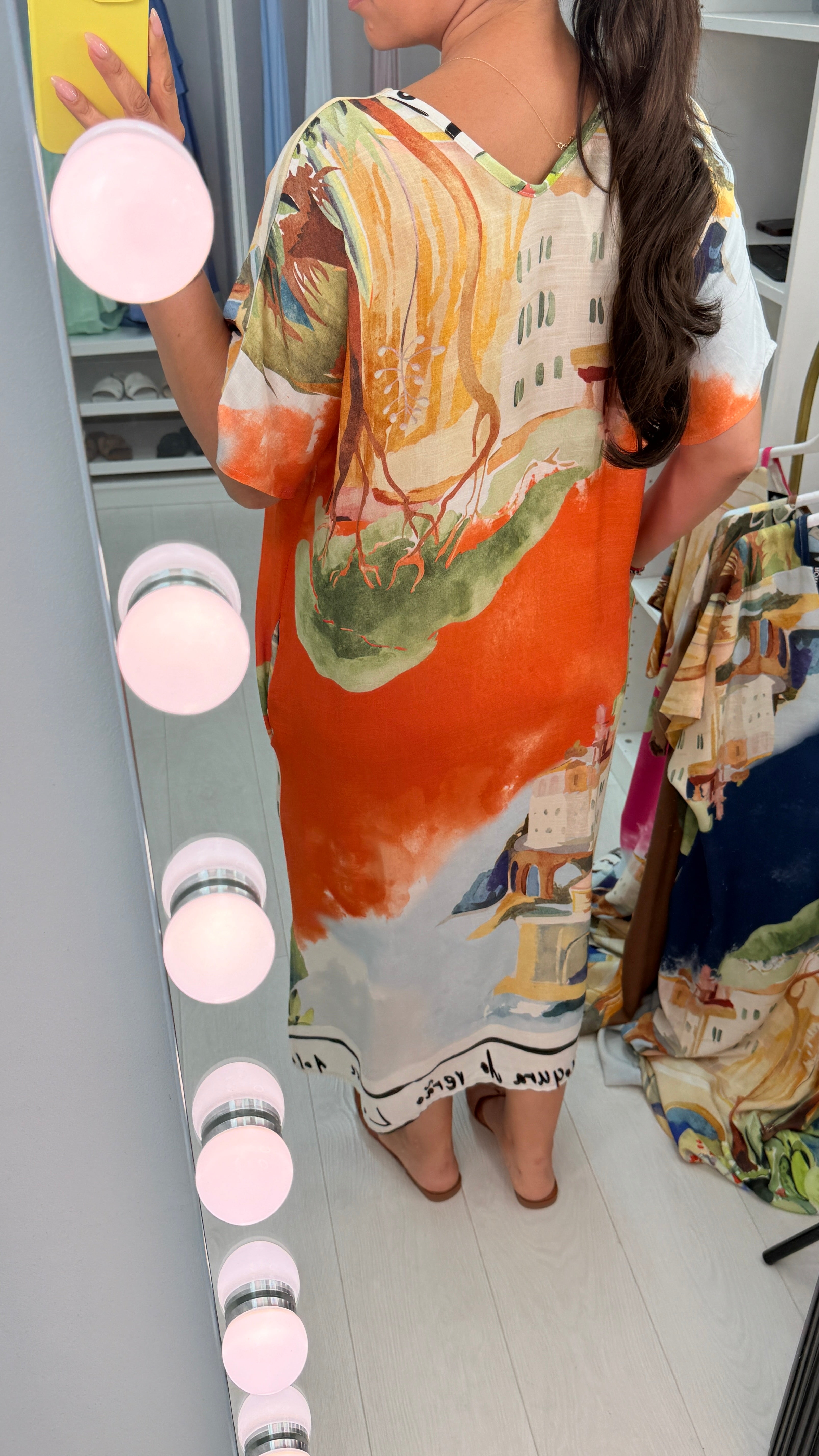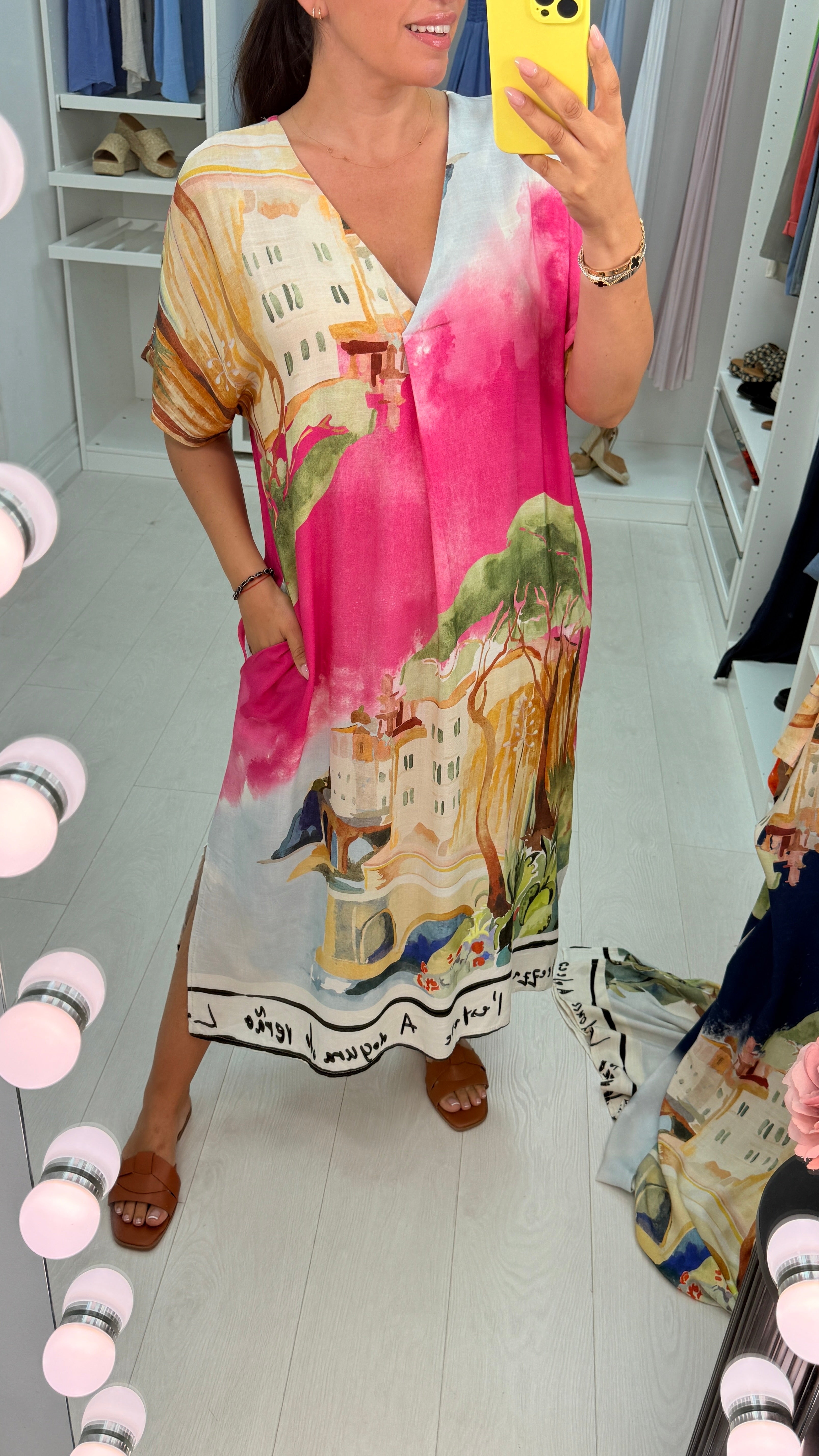 Experience effortless elegance with the Liana Printed V Neck Loose Fit Maxi Dress. Featuring a captivating building and sea scenery print, this lightweight maxi offers a relaxed fit and flattering V neckline, perfect for warm days and breezy evenings. Its flowing silhouette ensures comfort without compromising style, making it an ideal choice for both casual outings and special occasions. Embrace a blend of artful design and breathable fabric that moves with you throughout your day, plus it has pockets!
