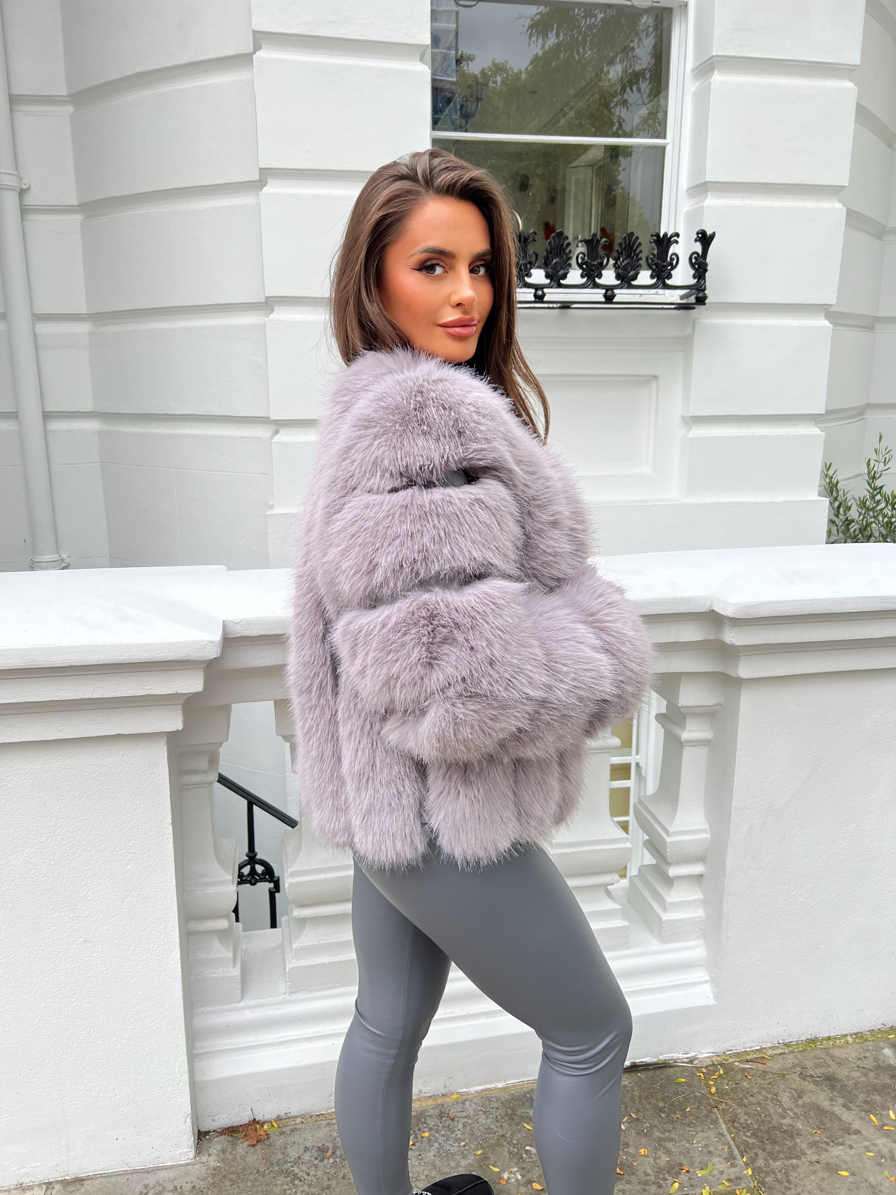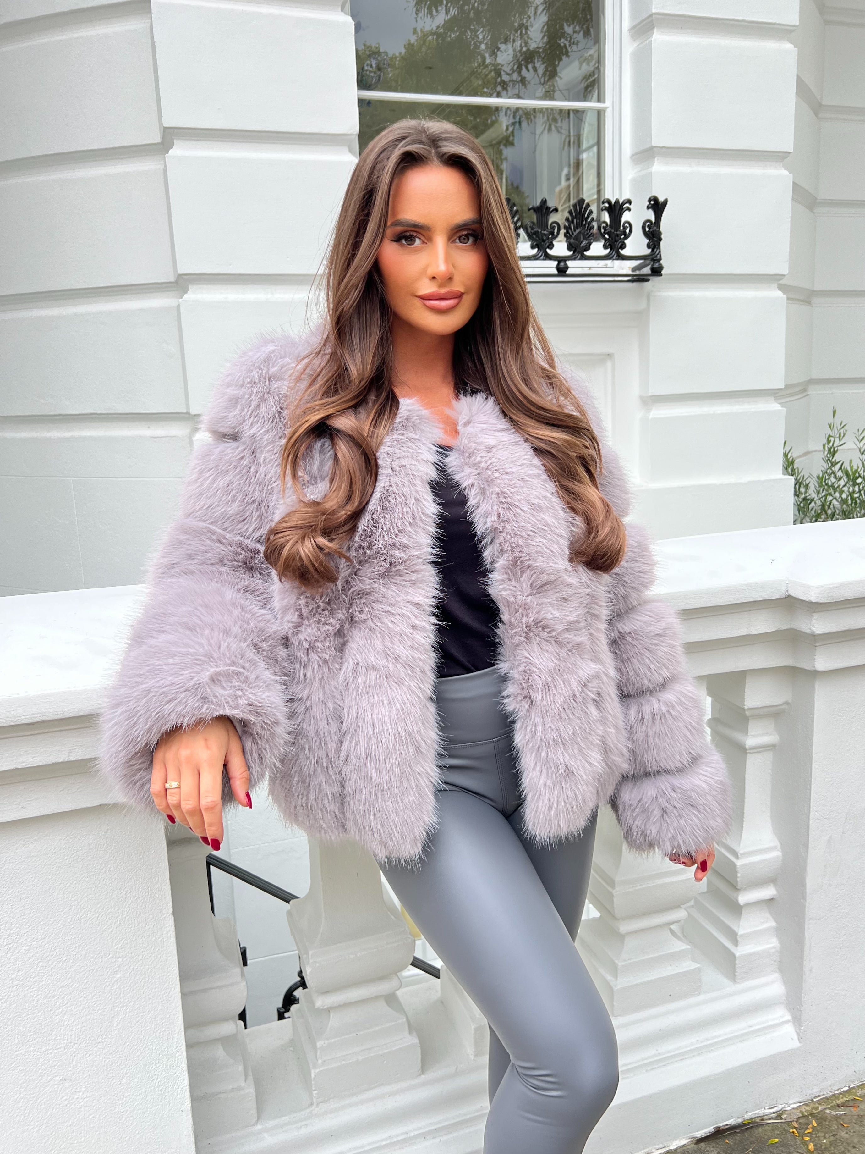 Light Grey Vertical Design Faux Fur Coat