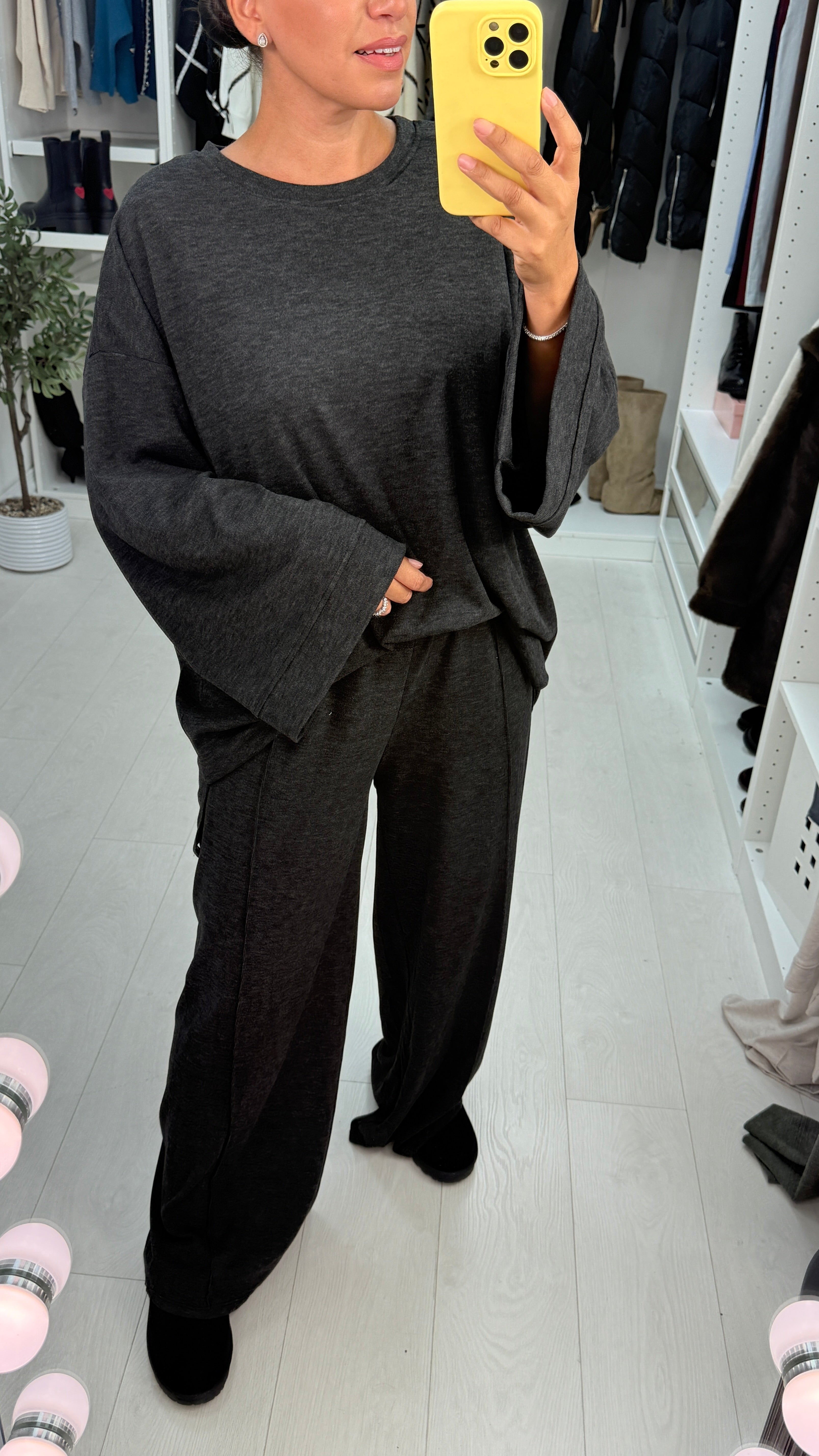 Experience effortless comfort with the Suzey Plain Loose Fit Loungewear Set. The soft stretch rib fabric and loose fit create a relaxed silhouette ideal for all-day wear. The top features long, loose sleeves and a round neck for easy layering, while the trousers offer a comfortable elasticated waist and wide legs for freedom of movement. Perfect for lounging or casual outings, this set combines cozy materials with a stylish, understated design.