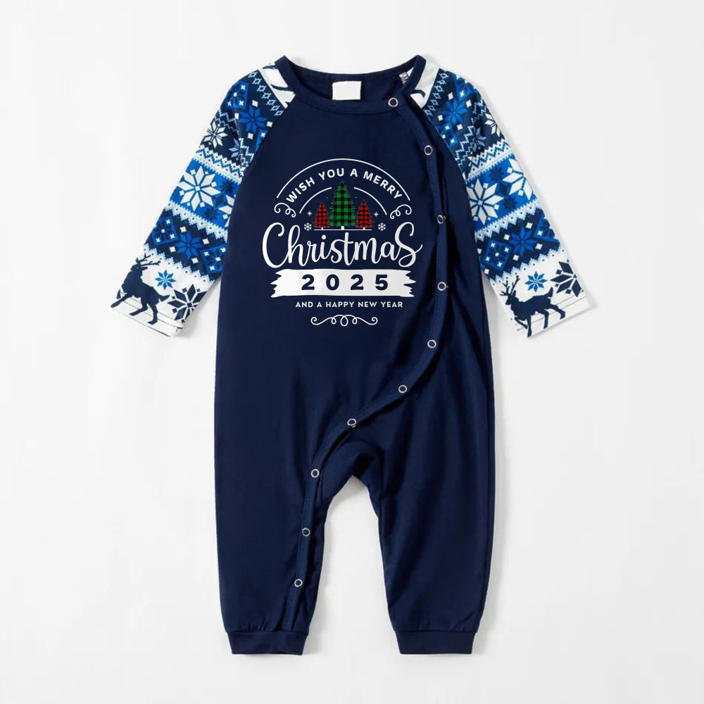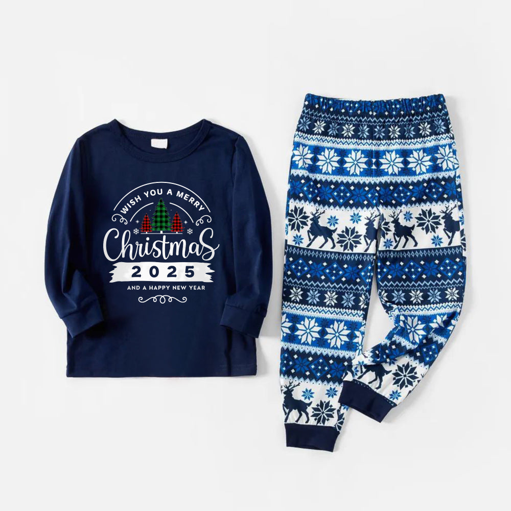Joyful Blue Christmas Pajamas Set With With "Wish You A Merry Christmas 2025 and Happy New Year" Print