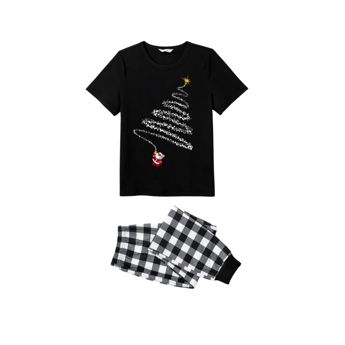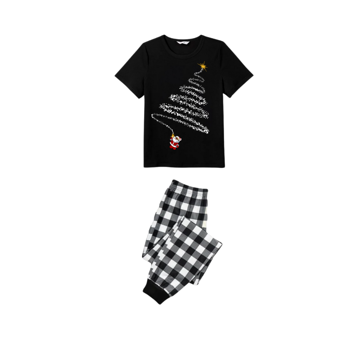 Santa Climbing Christmas Tree Family Pajamas Set - Black Top Black and White Plaid Pants White Tree Graphic