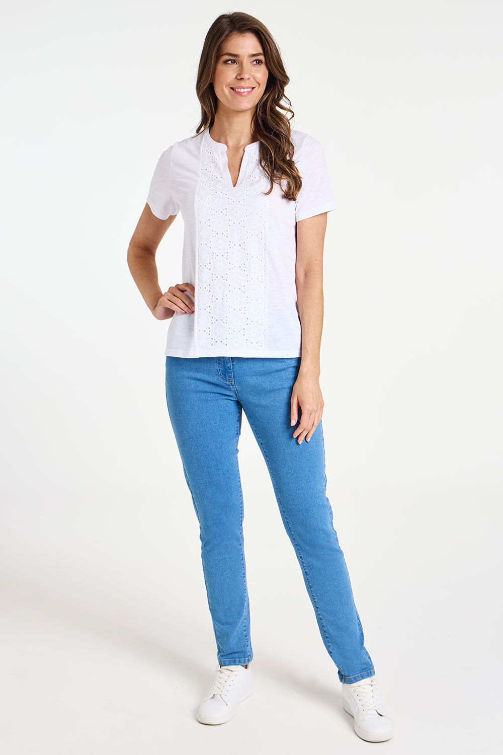 Update your wardrobe essentials with this pretty textured t-shirt. It features a flattering notch neckline and broderie panel detailing. Pair this t-shirt with a pair of your favourite jeans and trainers for a great causal look. Length: 64 (cm) 25 (inch) Material: Main: 80% Polyester, 20% Cotton, Trim: 100% Cotton Product Care: Machine Washable Product Code: 9008573 Size & Fit