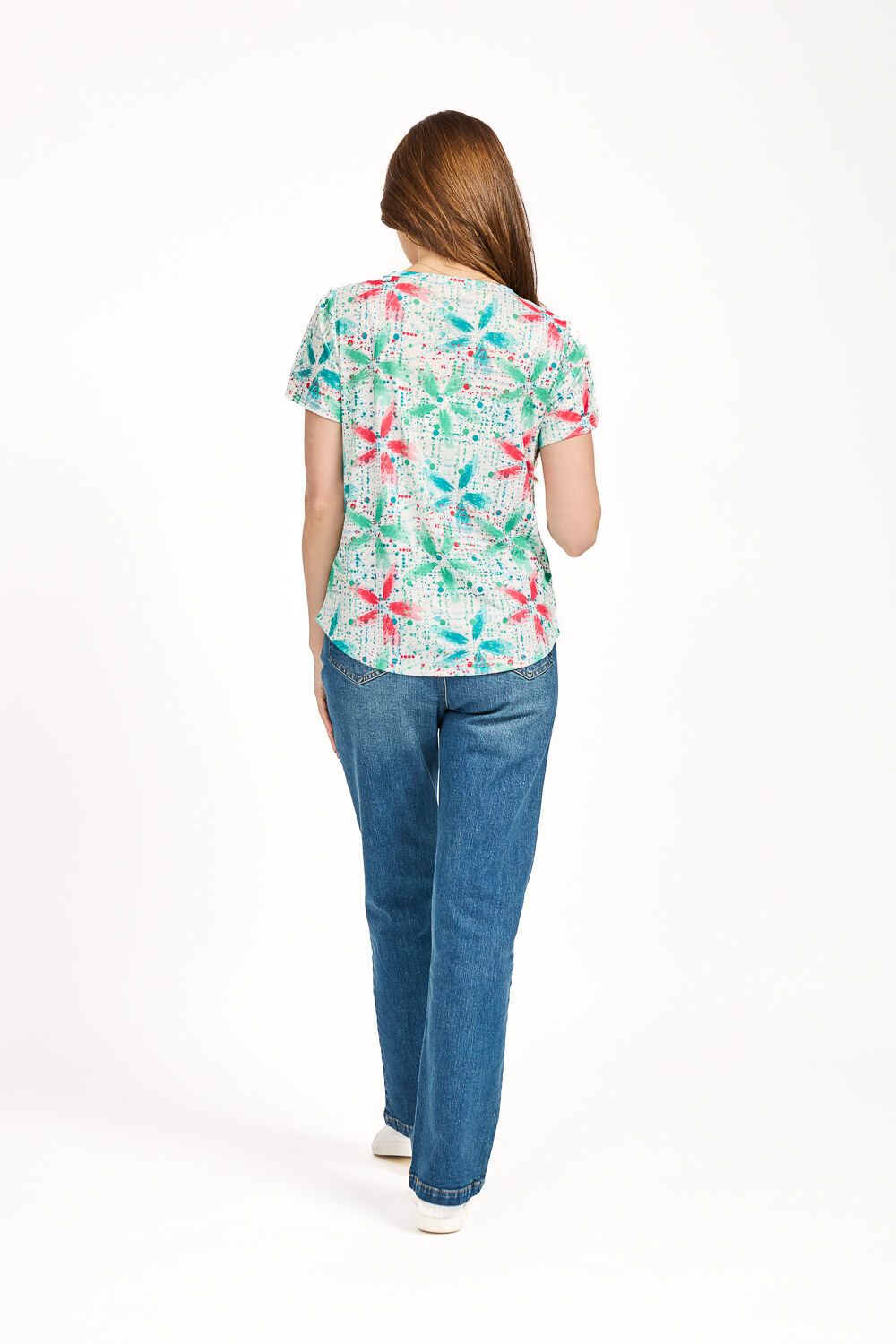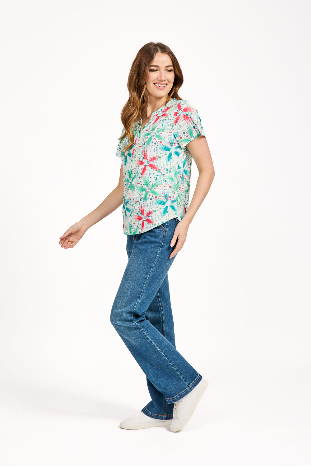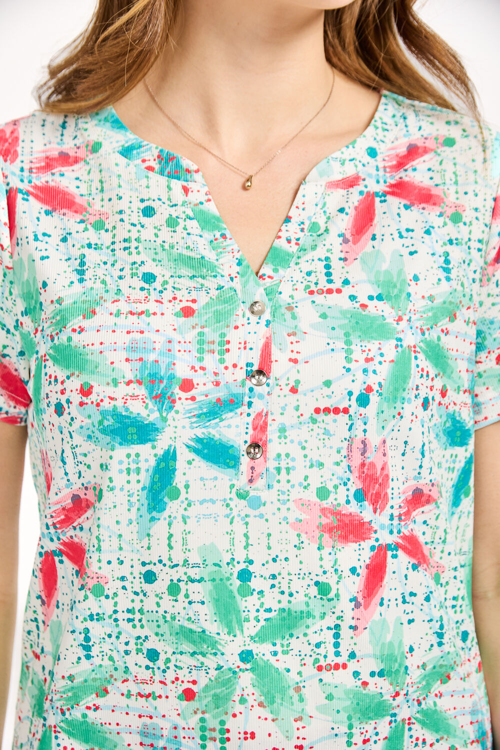 MUDFLOWER | Add our fun Floral Splash Print Top to your spring-summer wardrobe. It is designed with an all-over floral pattern with bursts of paint splashes creating a fun and vibrant feel to your look. Its stylish silver-cloured buttons add elegance to the top whilst the soft, lightweight and stretchy fabric ensures you stay comfortable whatever your errands. Complete your look with a pair of denim jeans, a pair of sandals or boots finished with minimal jewellery for an effortless look