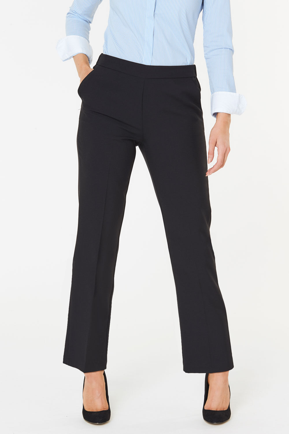 These straight leg trousers with an elasticated waistband, create a smooth, flattering fit. With a pull on design they are perfect for teaming with a pretty blouse for everyday workwear. Material: 100% Polyester Product Care: Machine Washable Product Code: 119619 Size & Fit